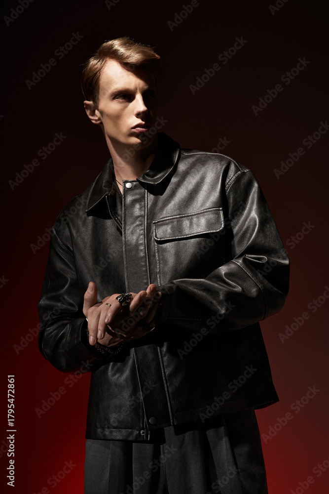 Captivating young man embodies modern masculinity in stylish dark attire #1795472861