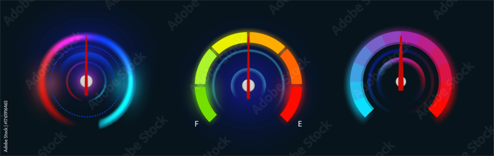 Car speedometer gauges with neon light panel and dials. Vector dashboard indicators on tachometers. Speed meter mph readouts with loading bars and battery, fuel and velocity level scales #1761916465