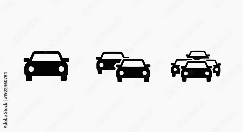 Car traffic jam and congestion icon set, frontal view automobile silhouettes, urban transport symbols isolated on white. #1922460794