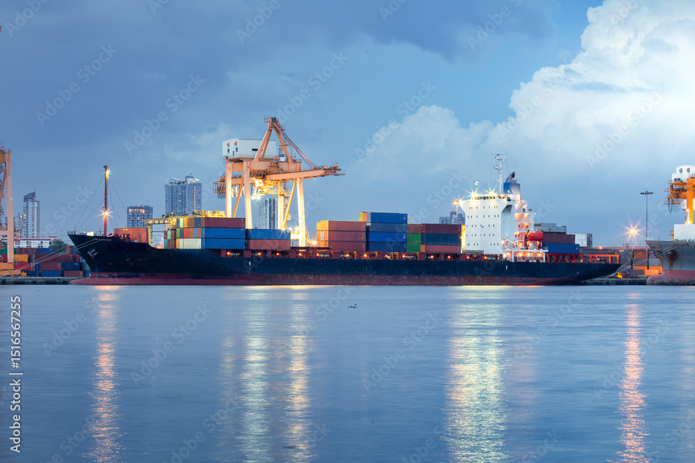 Cargo ship loaded with shipping containers at busy port, representing global trade, international shipping, logistics, maritime transport, import export business, and worldwide commerce. #1516567255