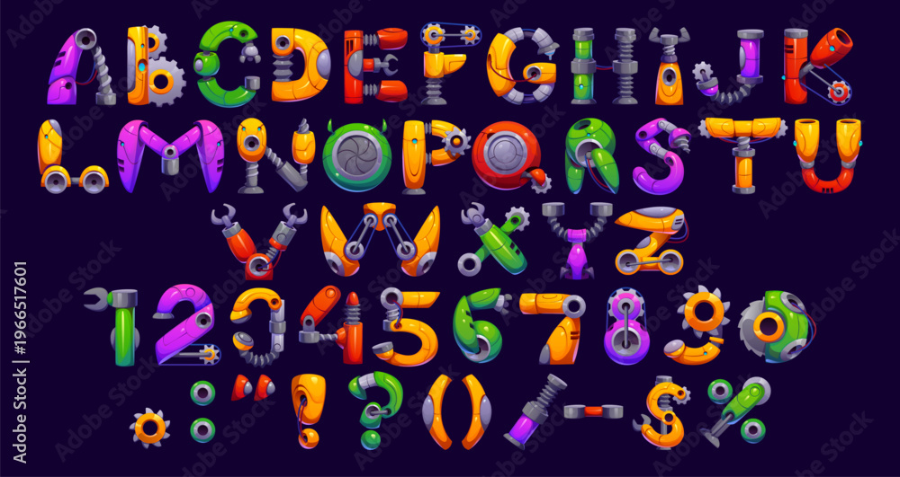 Cartoon robot hand font, gear wheel typeface, cyborg machine type, engineering English alphabet. Kids abc vector uppercase letters, digits and punctuation marks characters made of machine parts #1966517601