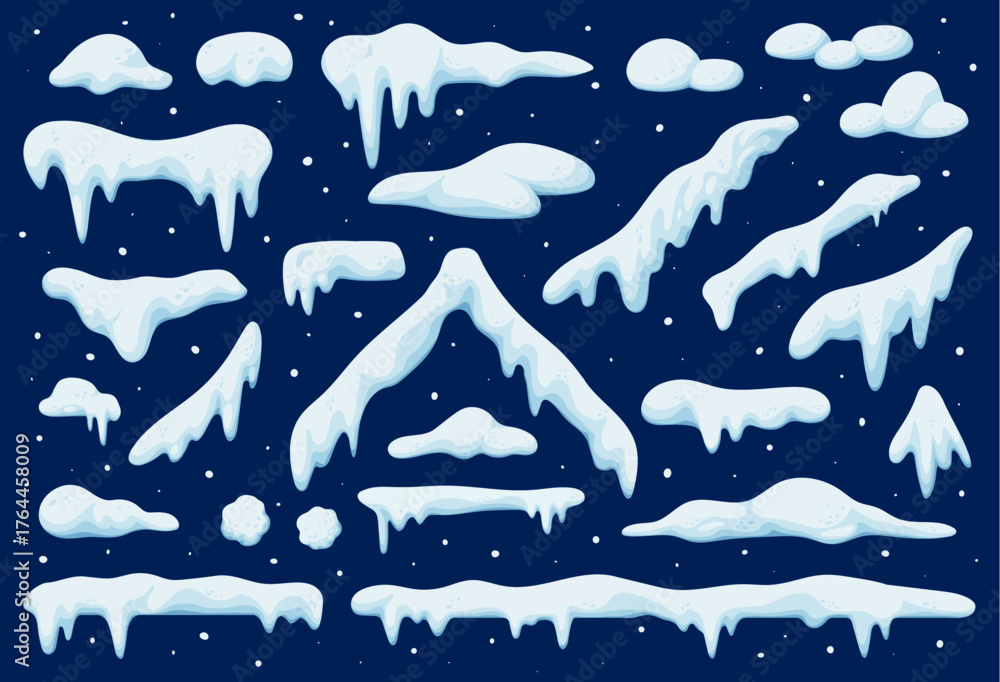 Cartoon winter vector snow caps and drifts, snowball and snowflakes. Christmas window, chimney or roof snowy ice piles, curved snow blanket isolated on dark blue background. Winter snowy roof framing #1764458009