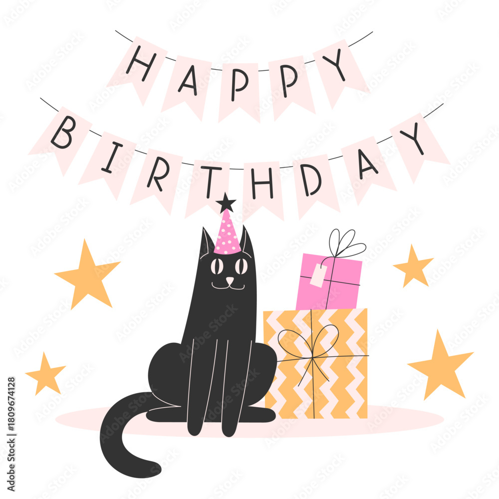 Cat in festive party hat among gifts, cute illustration for birthday greeting card #1809674128