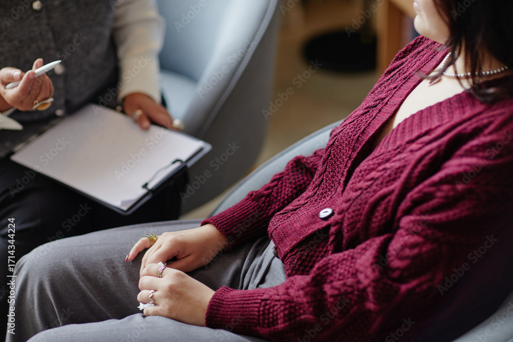 Caucasian young adult woman sitting in chair holding hands together while talking to therapist holding clipboard and pen during counseling session in office setting #1714344224