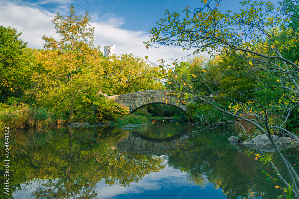 Central Park pond and Gapstow bridge with autumn trees and colorful leaves. New York. USA #1754841072