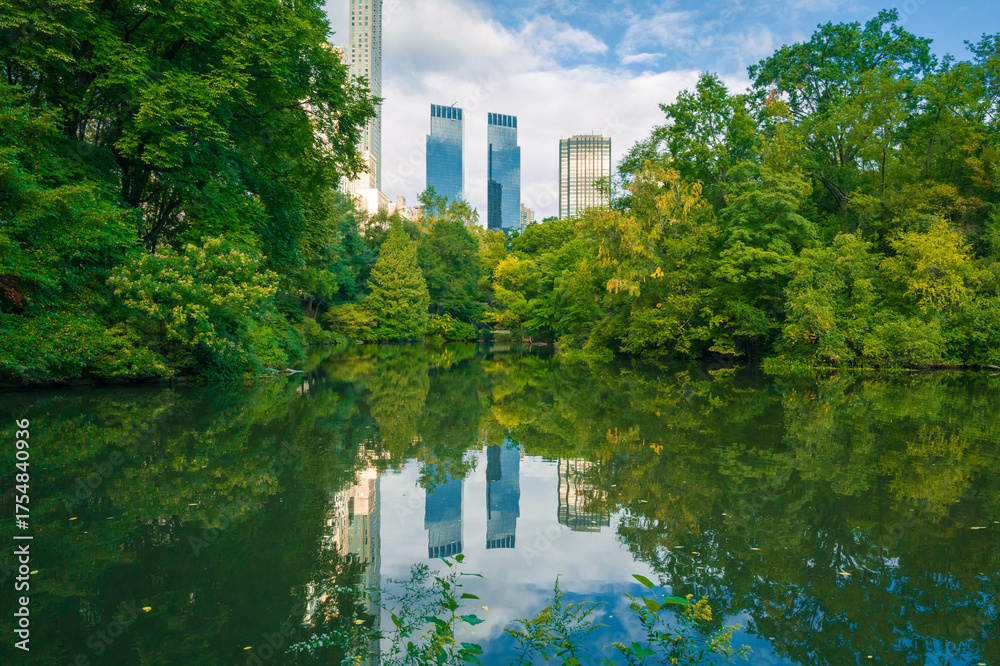 Central Park pond with autumn trees and beautiful water reflection. New York. USA #1754840936