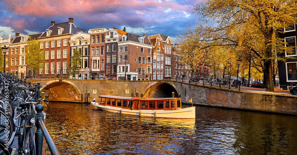 Channel in Amsterdam Netherlands Holland houses under river Amstel. Pleasure boat. Landmark old european city spring landscape with sunshine. #1782765342