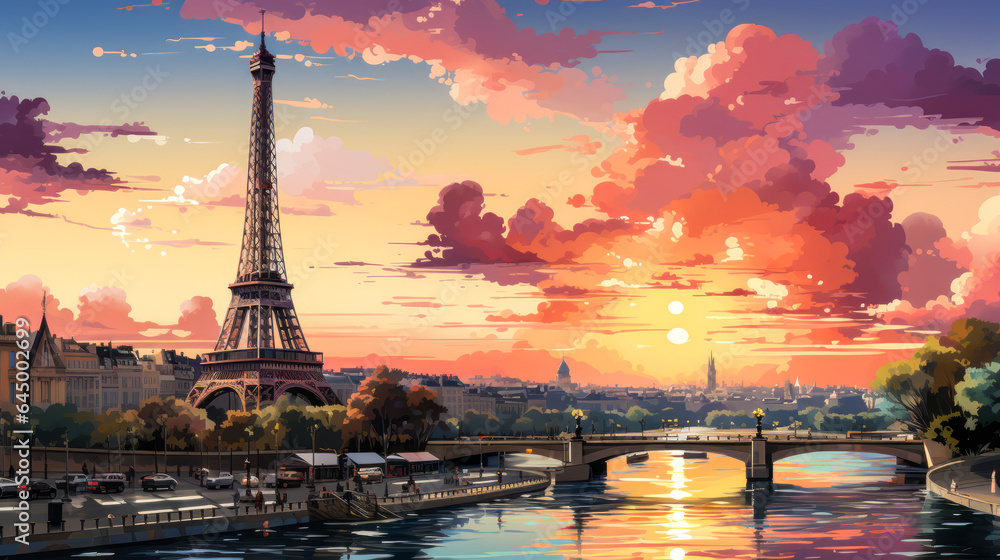 Charming flat design of the iconic Eiffel Tower against a pastel sky, enhanced with simple Parisian elements including the Seine River and cafes. #645002699