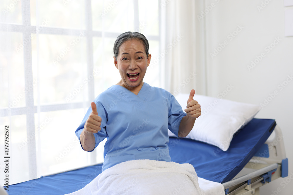 Cheerful senior woman in medical gown sitting on hospital bed shows enthusiasm with thumbs up gesture. #1777752572