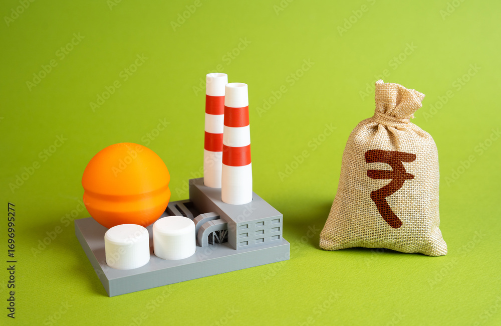 Chemical plant with rupee money bag. Symbol of Indian energy economy, fuel dependence, and oil trade. Suitable for petrochemicals, finance, and industry analysis. #1696995277