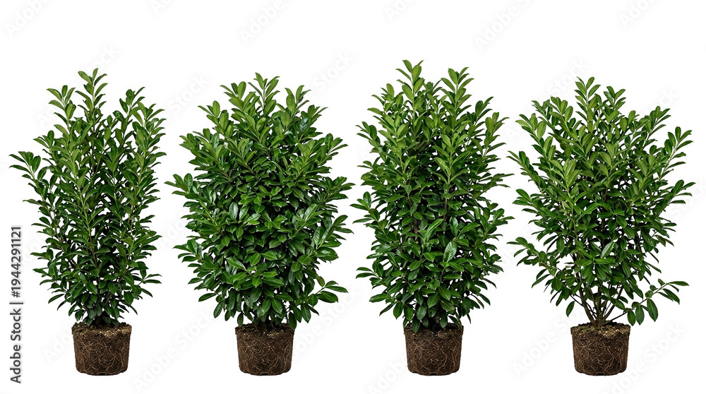 Cherry laurel, Prunus lauroceras, Hedge shrub, Green plant, Root ball, Garden landscaping, Evergreen bush set isolated on black background for nursery gardening and landscape design. #1944291121