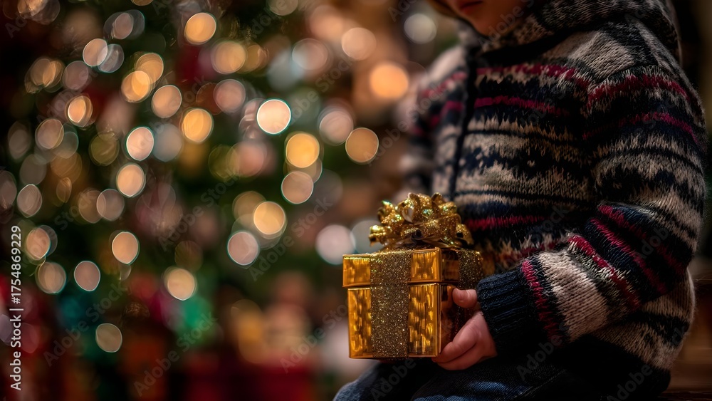 Child in a patterned sweater holds a gold glitter gift in front of a Christmas tree with colorful bokeh lights. Concept Holiday Child Portrait, Patterned Sweater, Glitter Gift, Christmas Tree #1754869229