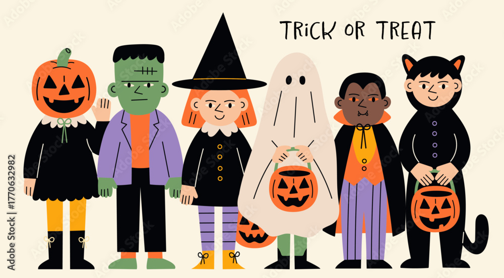 Children in Halloween costumes. Little kids in festival carnival clothes. Cute characters. Pumpkin head, Frankenstein's monster, witch, ghost, Dracula, black cat. Hand drawn Vector illustration #1770632982