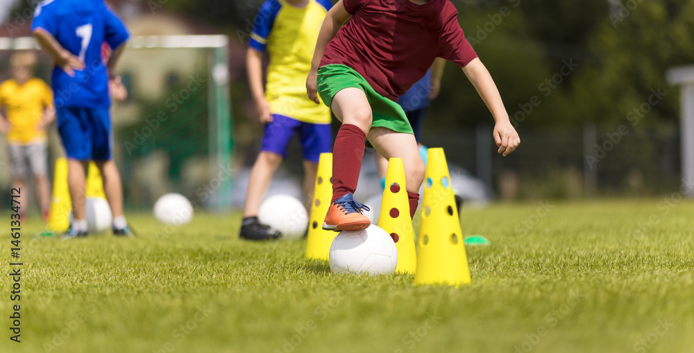 Children Practicing Soccer Drills on Field with Cones During Youth Training Camp #1461334712