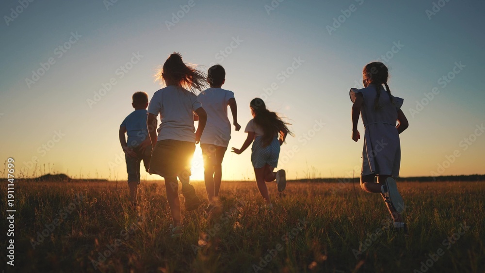 children running in the park silhouette. people in park. children a kid together run in park at sunset silhouette. group of lifestyle children run. happy family and little baby child summer #1911147699