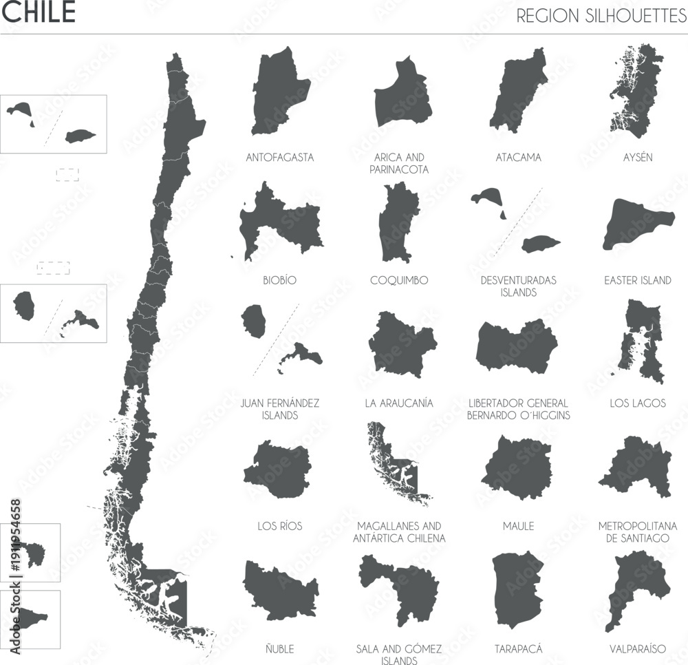 Chile region silhouettes set and blank map of the country isolated on white background. Vector illustration design #1911954658