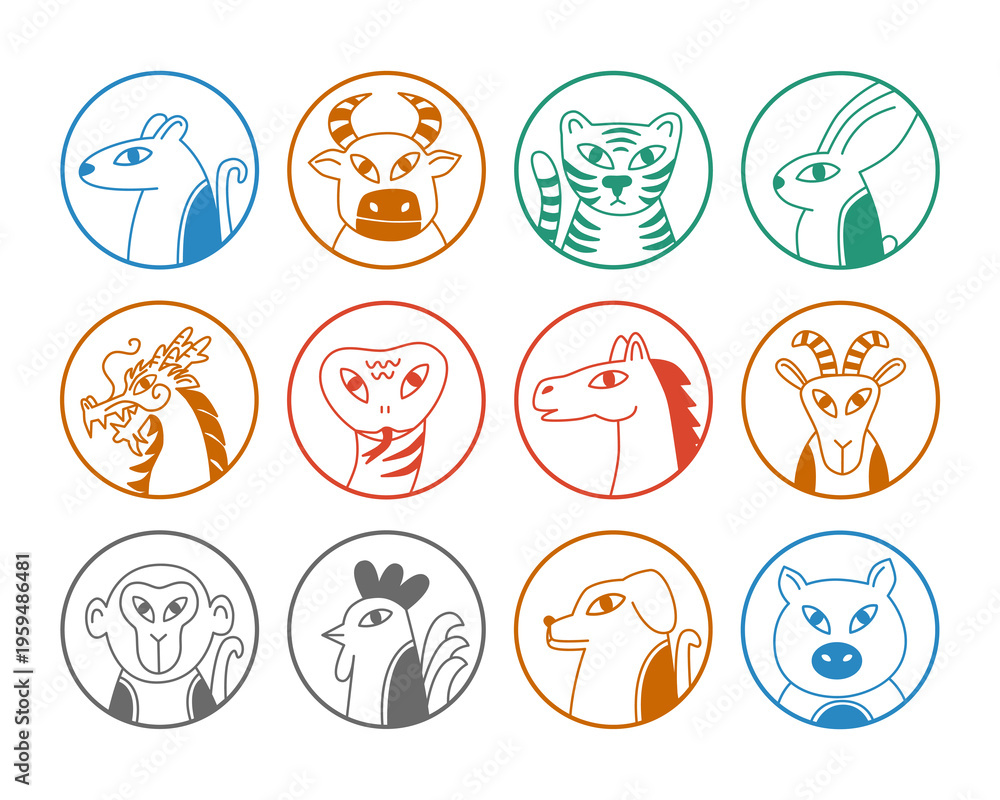 Chinese Zodiac, animals signs, horoscope, 12 earthly branches, Shengxiao, vector illustration #1959486481