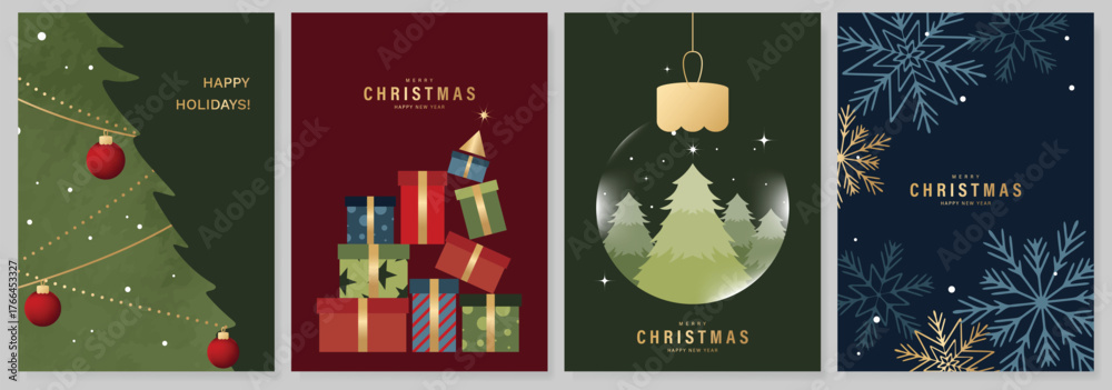 Christmas and Happy holiday greeting card vector set. Elegant wallpaper with pine tree, gift, bauble, snowflake. Holidays design illustration for cover, print, poster, Happy New Year, ads. #1766453327