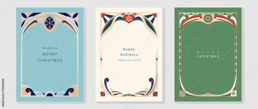 Christmas and Happy Holidays card vector set. Glasswork decorative, gothic stained glass and snowflake on blue, green and light background. Design illustration for poster, cover, product, ads. #1744663209