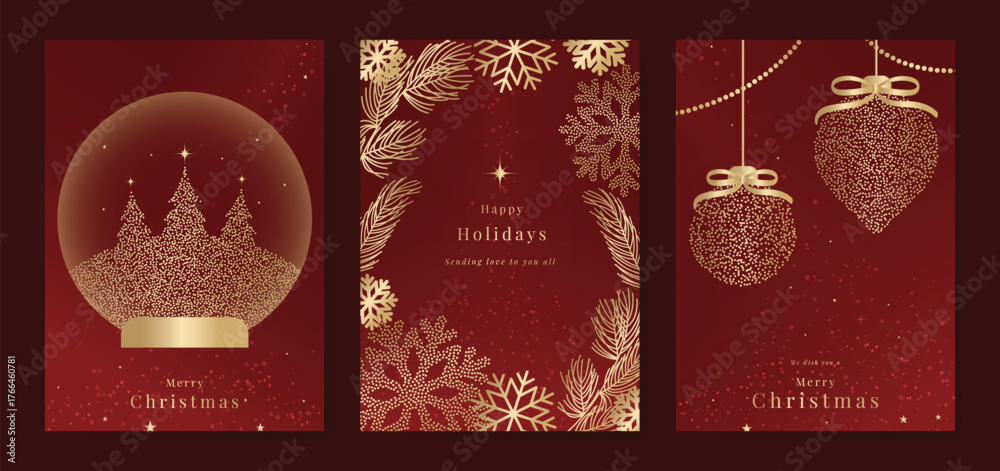 Christmas and Happy Holidays card vector set. Luxury gold victorian frame, leaves branch, flower, star, snowflake on navy blue background. Design illustration for poster, cover, invitation, ads. #1766460781
