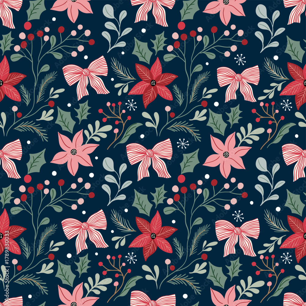 Christmas floral seamless pattern with red and festive bows, poinsettia, holly leaves, pine branches, and snowflakes on a dark blue background #1789830033