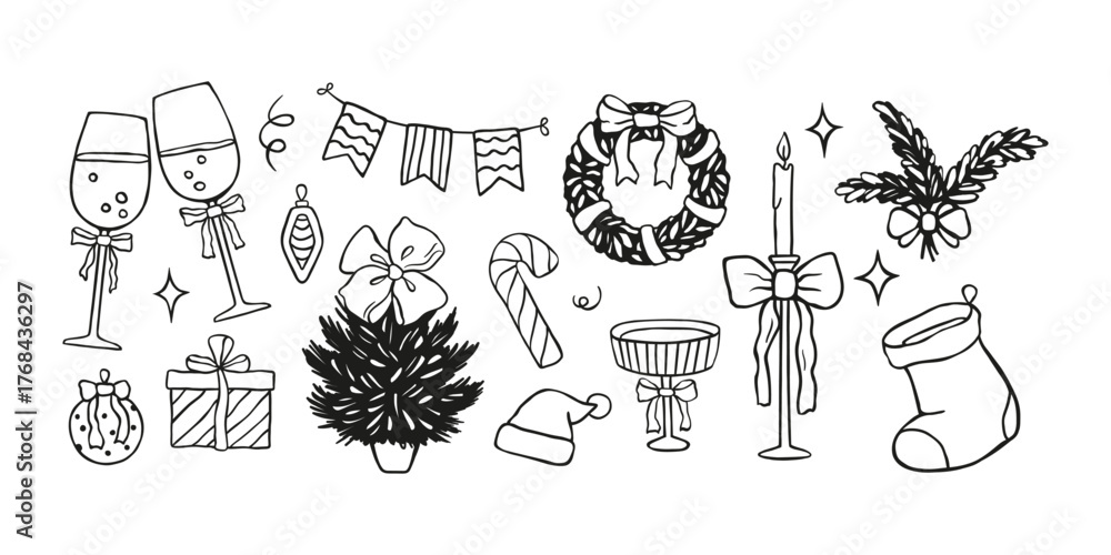Christmas hand drawn elements. Whimsical New Year objects. Black chalk outline traditional graphics for greeting cards, celebration invitations. Coquette holiday collection. Vector illustration. #1768436297
