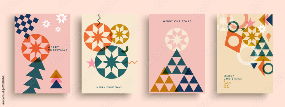 • #551848261 Christmas New Year retro geometric transparent shape card set