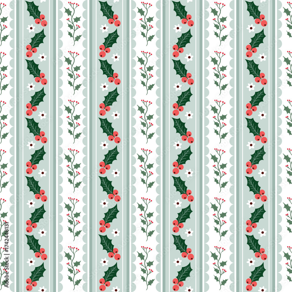 Christmas seamless pattern with holly leaves and berries, vertical striped wallpaper, seasonal winter background #1742448131