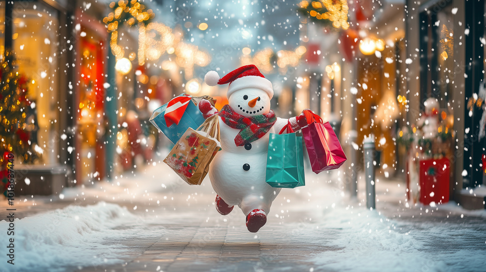 Christmas shopping. Funny snowman running holding holiday shopping bags in shopping street with sparkling lights and falling snow, Joy of Christmas shopping. Image made using Generative AI. #1018637449