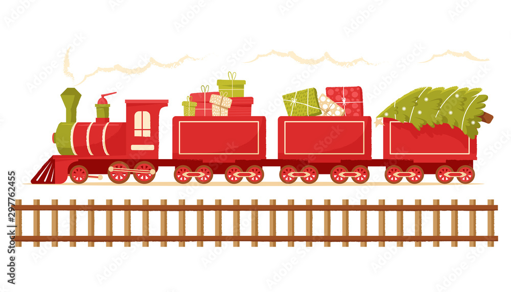 Christmas train carries a Christmas tree. Christmas toy locomotive for holiday cards, tags and greeting cards #297762455