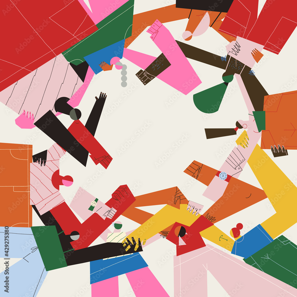 Circle of arms interlocked and helping hands. Diverse community and teamwork support each other by interlock hands and arms directly below in a meeting. Activism, diversity and inclusiveness. #429275380