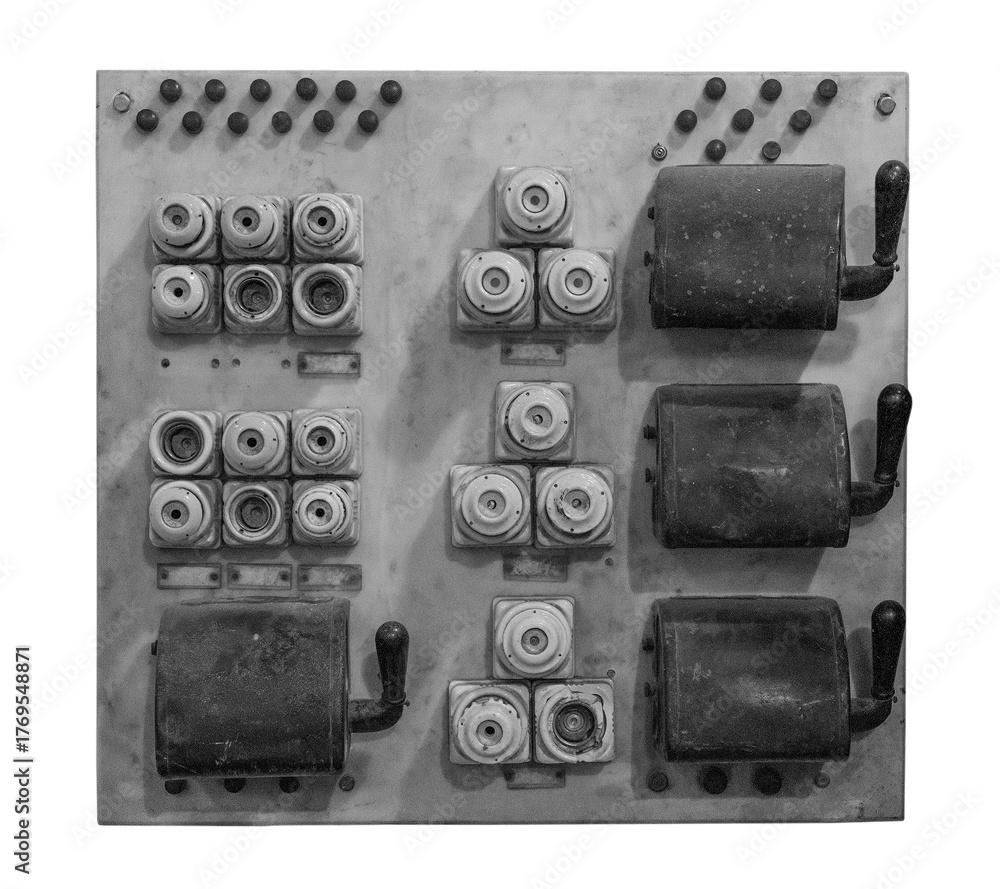 circuit breaker panel with switches and fuses on white, isolated #1769548871