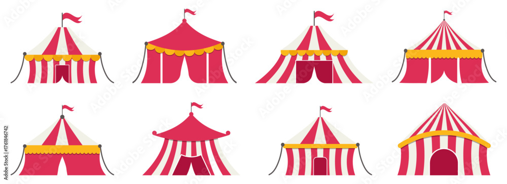 Circus tent collection with red and white striped roofs. Carnival pavilions and big tops for entertainment, show and festival #1761846742