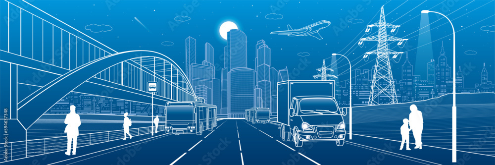 City transportation infrastructure illustration. Passengers get off the bus. people walk down the street. Energy pylons. Automotive highway. Cars move. Night town at background, vector design art #594637348