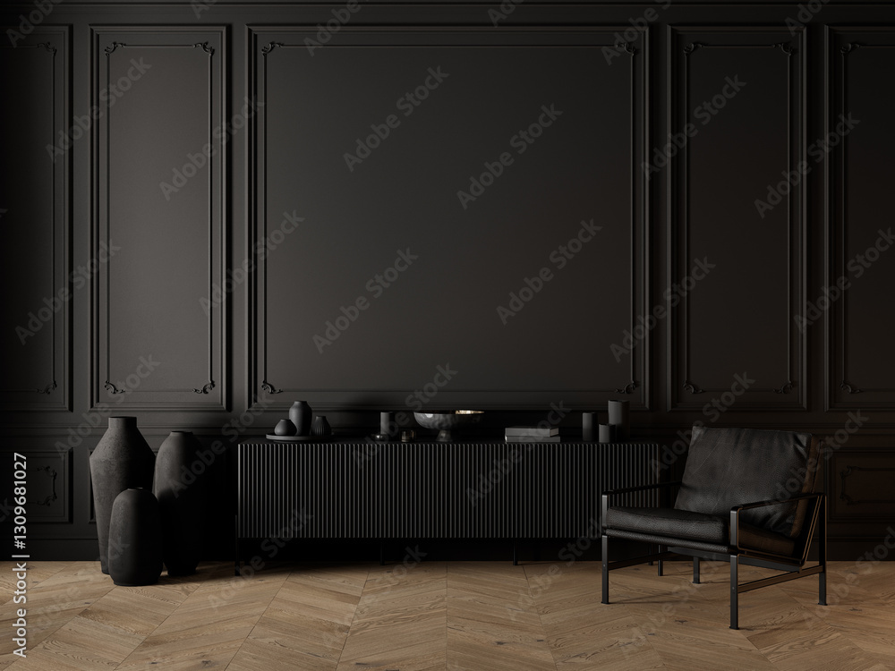 Classic black interior with dresser, armchair, vases, parquet chevron floor and decor. 3d render illustration mockup. #1309681027
