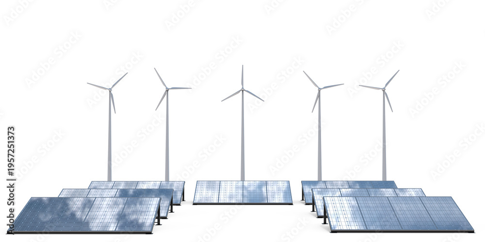 Clean energy from solar and wind farms represents the sustainability of renewable energy production. 3d rendering, Illustration #1957251373