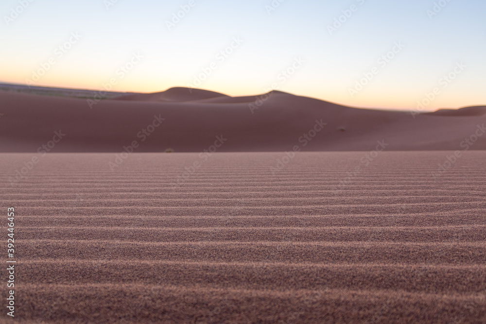 Close-up desert dunes of Erg Chigaga, at the gates of the Sahara, al amanecer. Morocco. Concept of travel and adventur #392446453