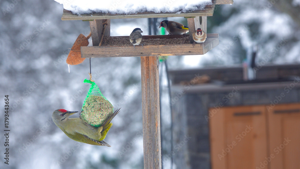 CLOSE UP: Green woodpecker clings to a fat ball beneath a snowy bird feeder while smaller colorful goldfinches gather above. The winter garden scene captures lively wildlife activity in cold weather. #1793443654