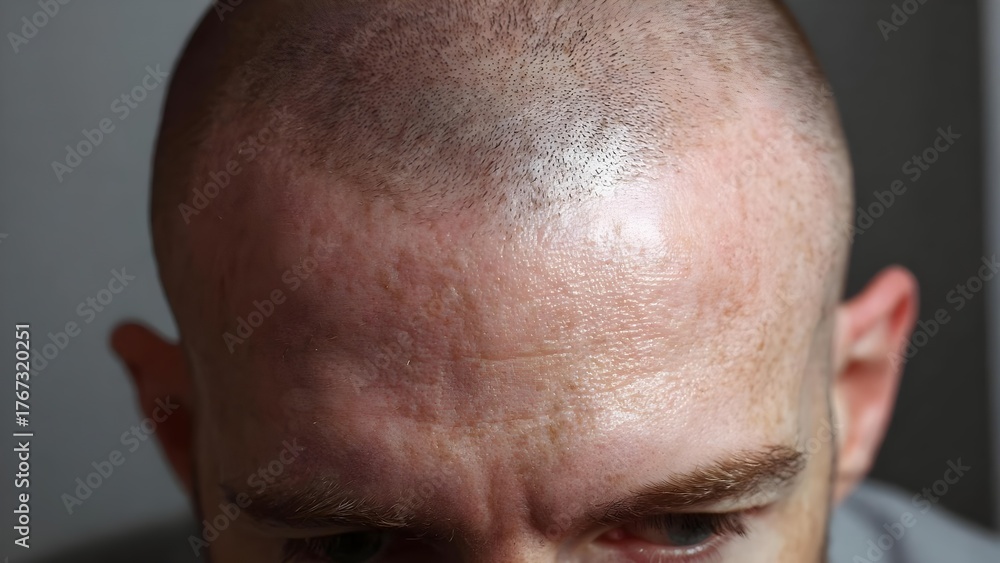 Close-up of a bald head with tiny dot scars on the scalp from a hair transplant. Concept Close-up scalp with hair transplant scars, Bald head portrait, Hair restoration microdots #1767320251
