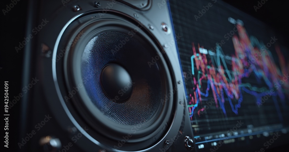 Close up of a large black speaker and a digital audio waveform display #1942504091