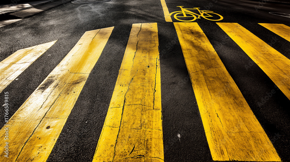 Close-up of a yellow bike lane symbol on a road crossing with bold stripes. Urban mobility, cycling infrastructure and street safety concept with strong color contrast. #1766589815