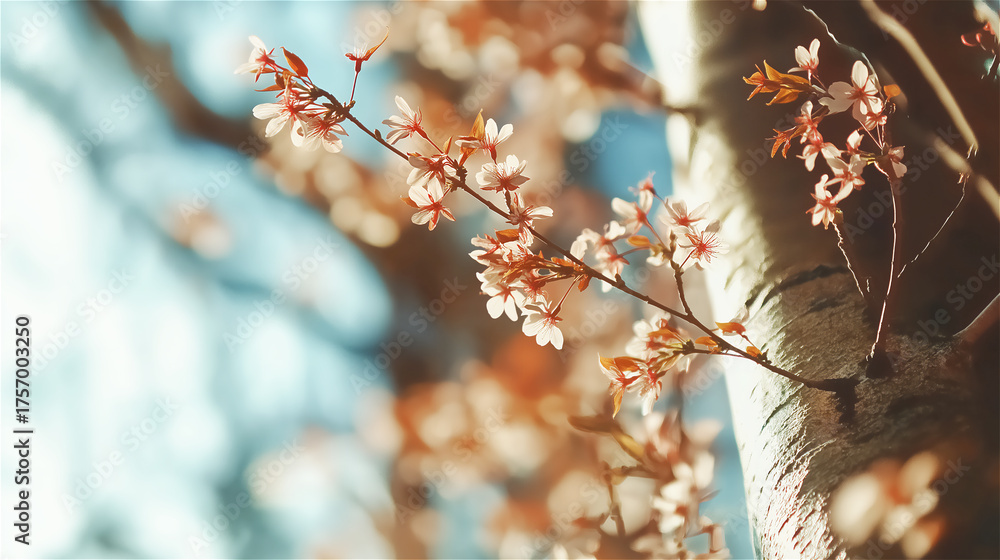Close-up of cherry blossom branch with delicate flowers against blurred background. Spring sakura blooms with soft pink petals creating natural floral detail with copy space. #1757003250