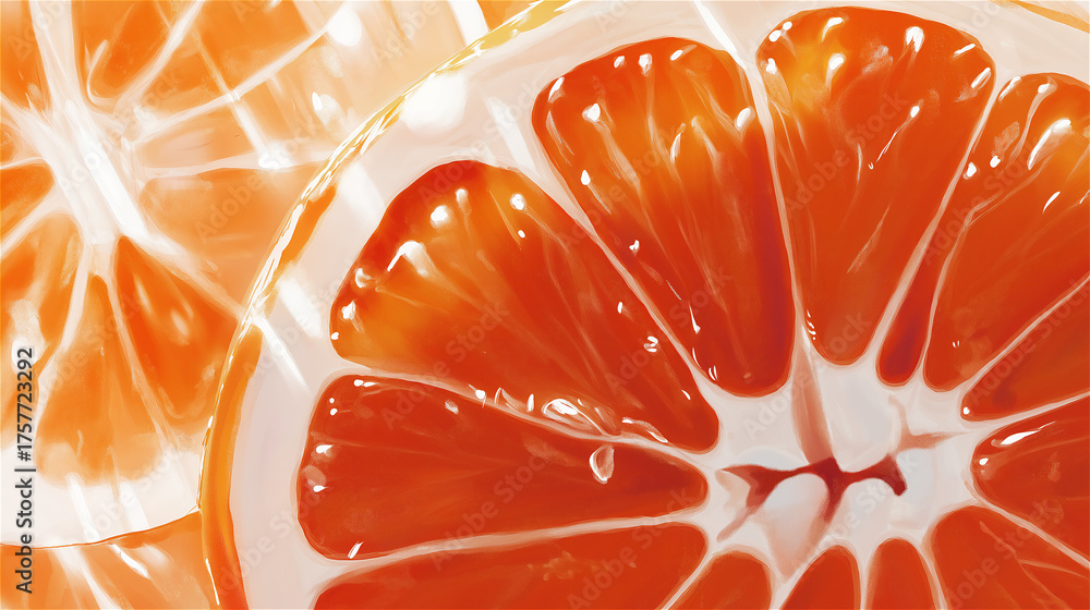 Close-up of juicy grapefruit segments with high detail and glossy texture. Abstract citrus pattern in vivid red and orange tones. Ideal for freshness and vitamin concepts. #1757723292