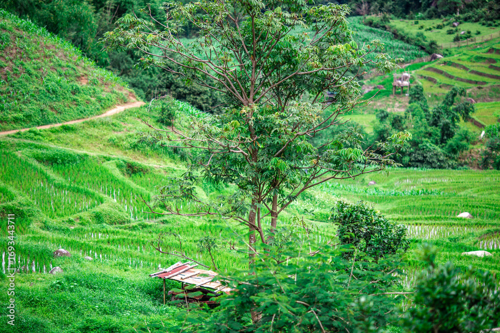 Close-up of natural atmosphere background of green rice fields, various grasslands next to mountains and natural streams flowing through. The beauty of Chiang Rai countryside. #1693443711