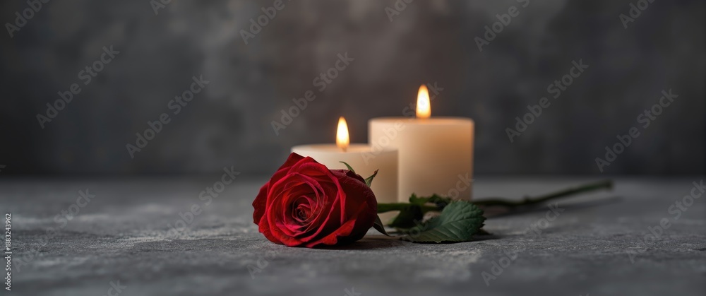 Close-up of red rose and candles symbolizing mourning, death, and sorrow on textured surface #1883243962