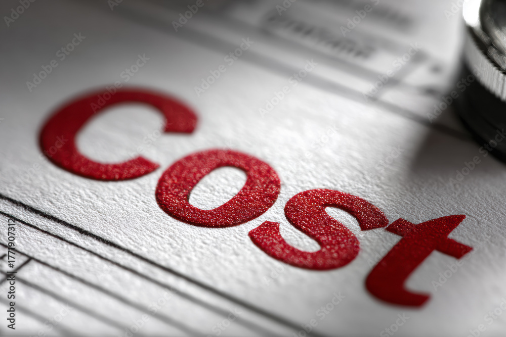 Close-up of the word cost printed in red and black on textured paper, symbolizing financial analysis, business expenses, and economic management. #1771907312