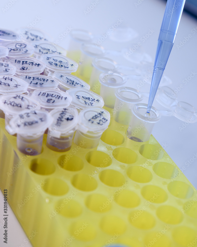Close-up pipette with drop of liquid over rack of plastic tubes for DNA studies. Concept of science, laboratory and study of diseases. Coronavirus (COVID-19) treatment developing. #331949813