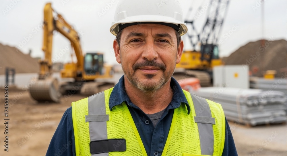 Close up portrait of a confident Hispanic construction worker. Male engineer wearing a hard hat and safety vest on an industrial job site #1745688548