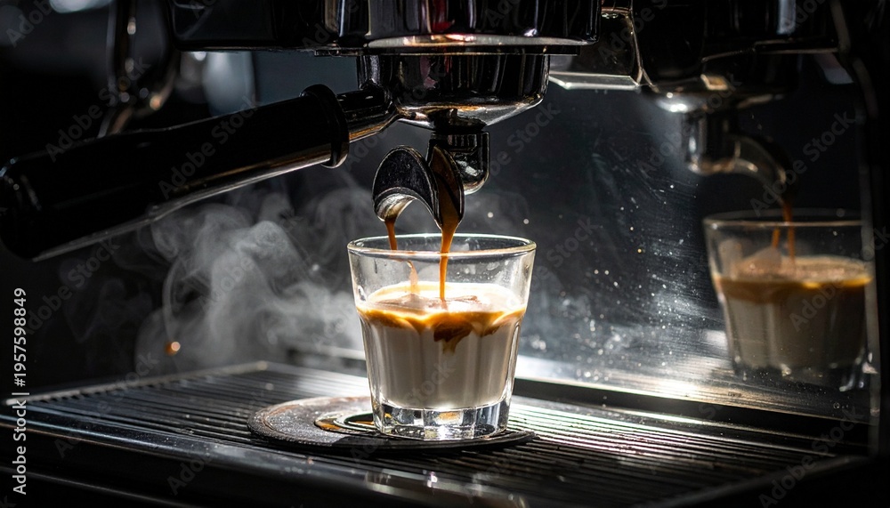 Close-up shot of espresso machine pouring espresso in a clear glass #1957598849
