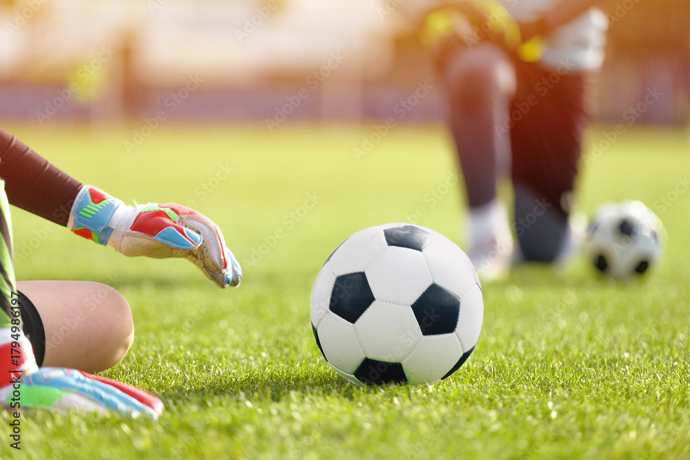 Close-Up Soccer Ball on Grass with Kids Playing in Background During Youth Football Goalkeeper Practice. Goalie in Action in Training #1794986197